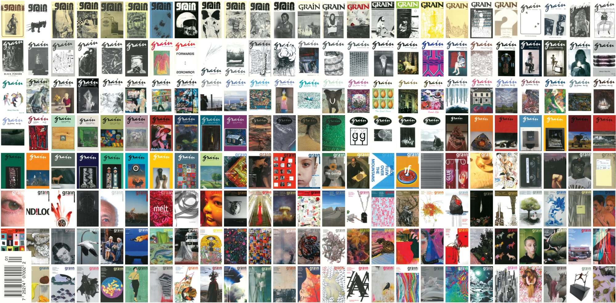 We’re not supposed to judge a book by its cover. But we do. We make assumptions, question the quality of writing, then ultimately decide whether or not to invest into the book our time and money. Book publishers know it, and magazine editors know it, too. But sales and marketing isn’t why, for 199 issues, the cover art for each issue of Grain was thoughtfully selected. And it’s not why fifty-two years worth of covers were crafted into one beautifully designed, fold-out cover, for this, Grain’s 200th issue.